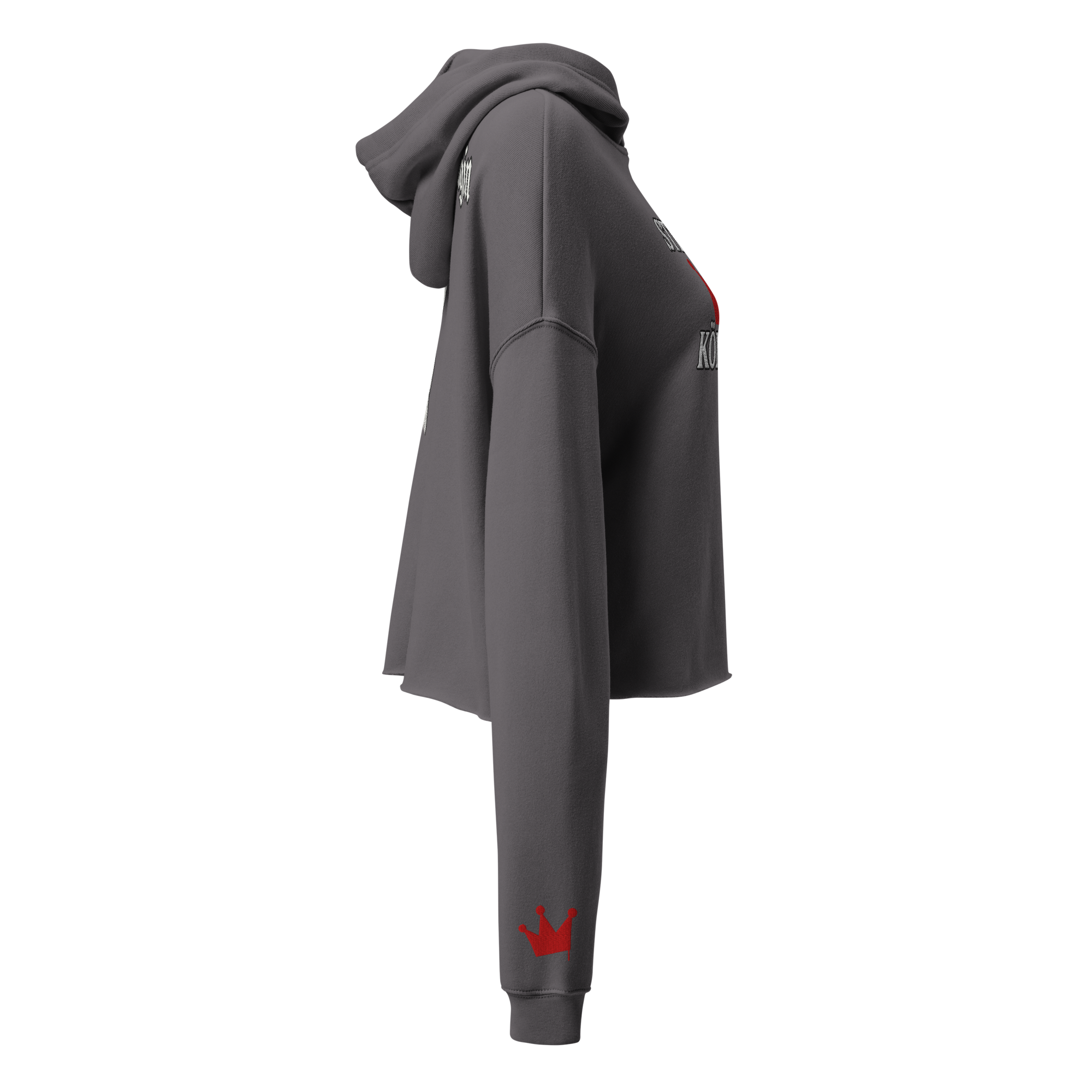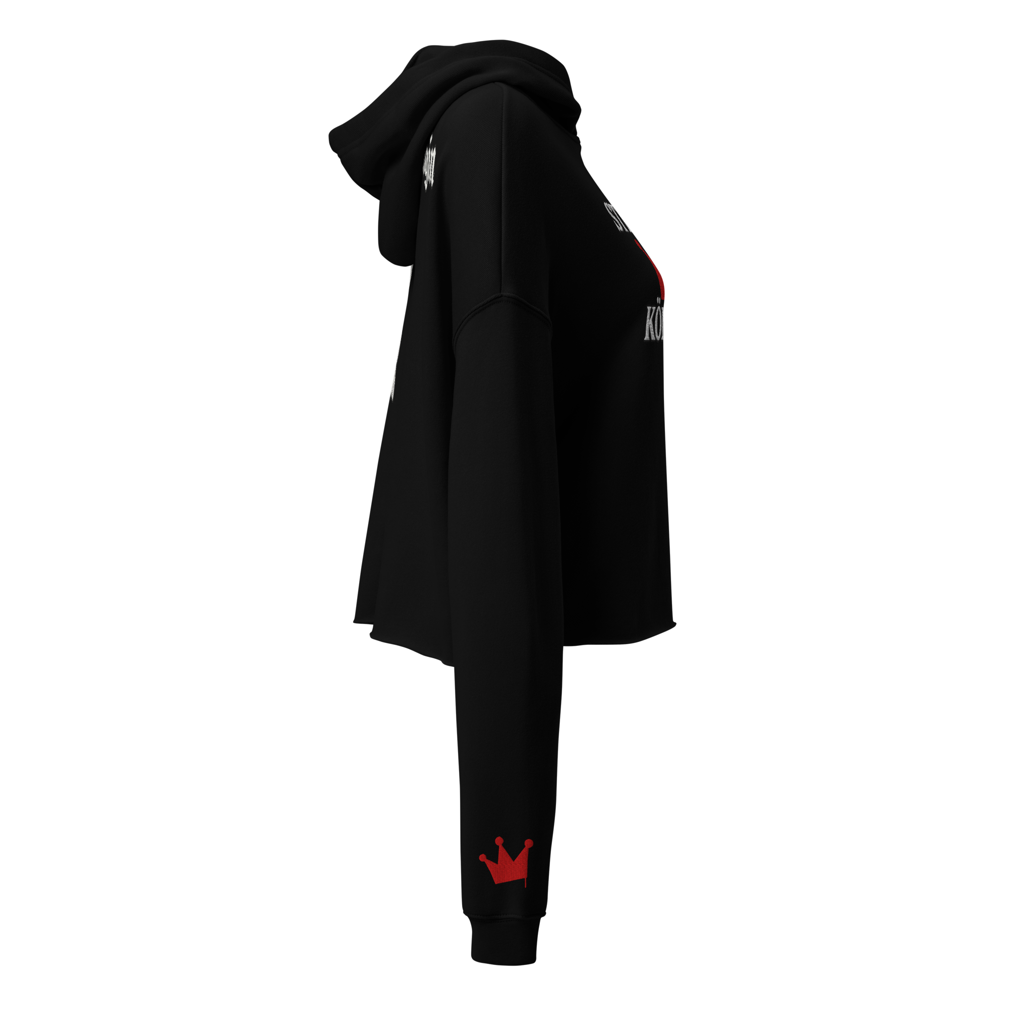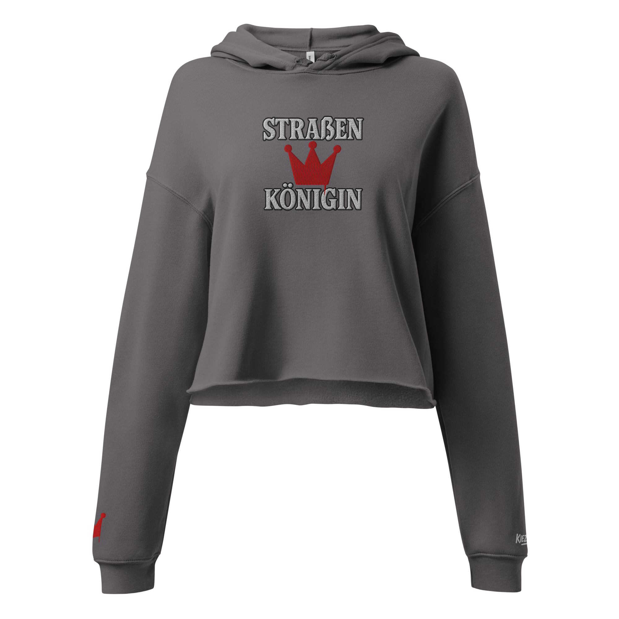 Dein Revier, deine Regeln: Moderner Cropped-Schnitt mit raw hem, dropped shoulders und farblich passenden Kordeln. Vorn und am Ärmel dezenter Stick, auf dem Rücken ein markanter „Straßenkönigin“ Print.
