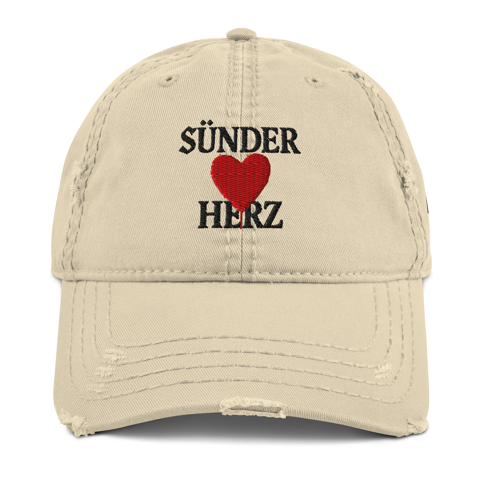 Unstrukturierte Dad Cap im Used-Look mit vorgebogenem Schirm und Front-Stick „SünderHerz“ – lässige Patina, klarer Kiez-Charakter.