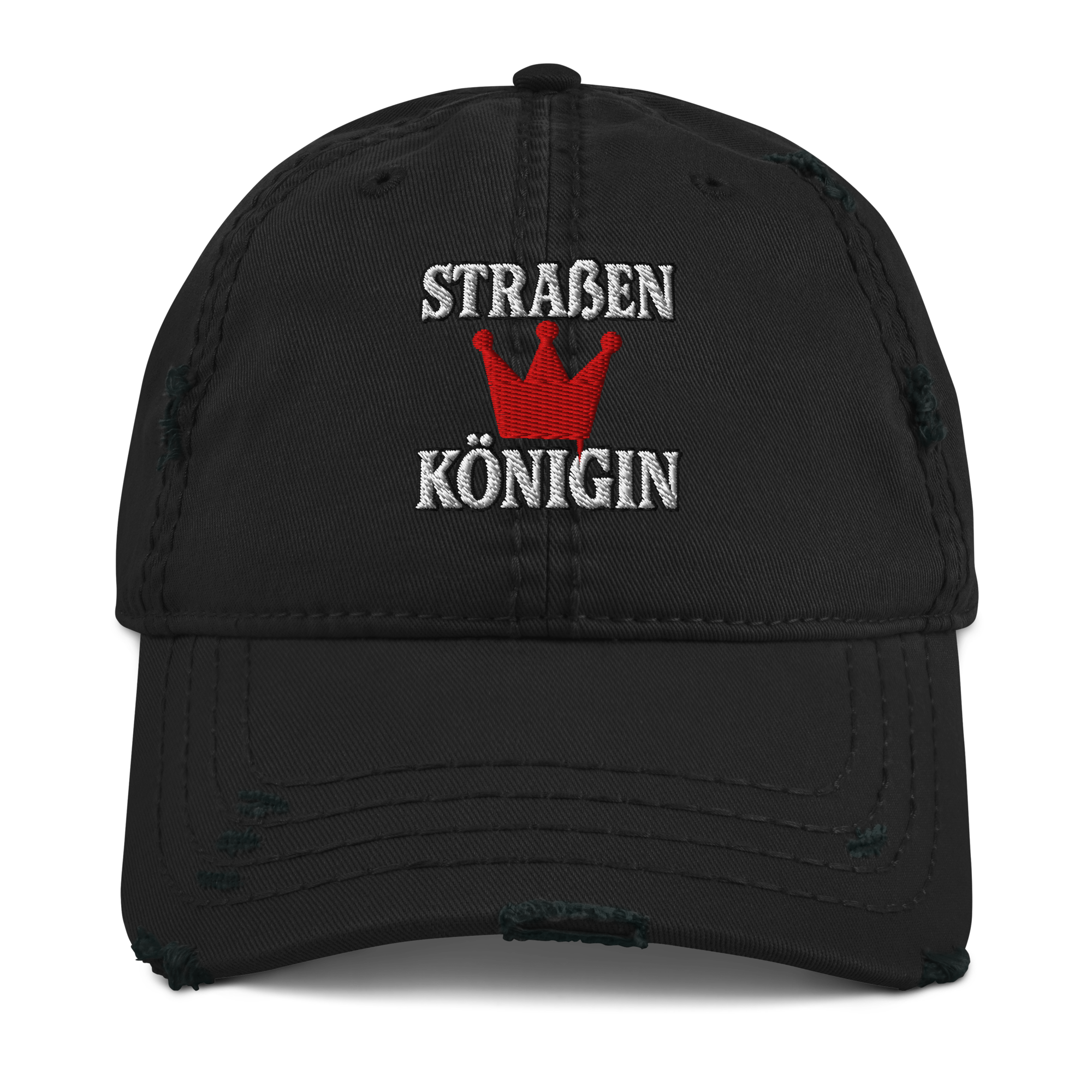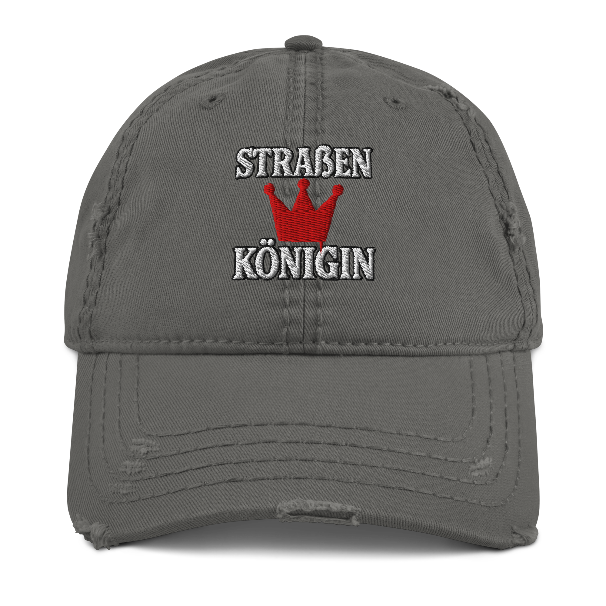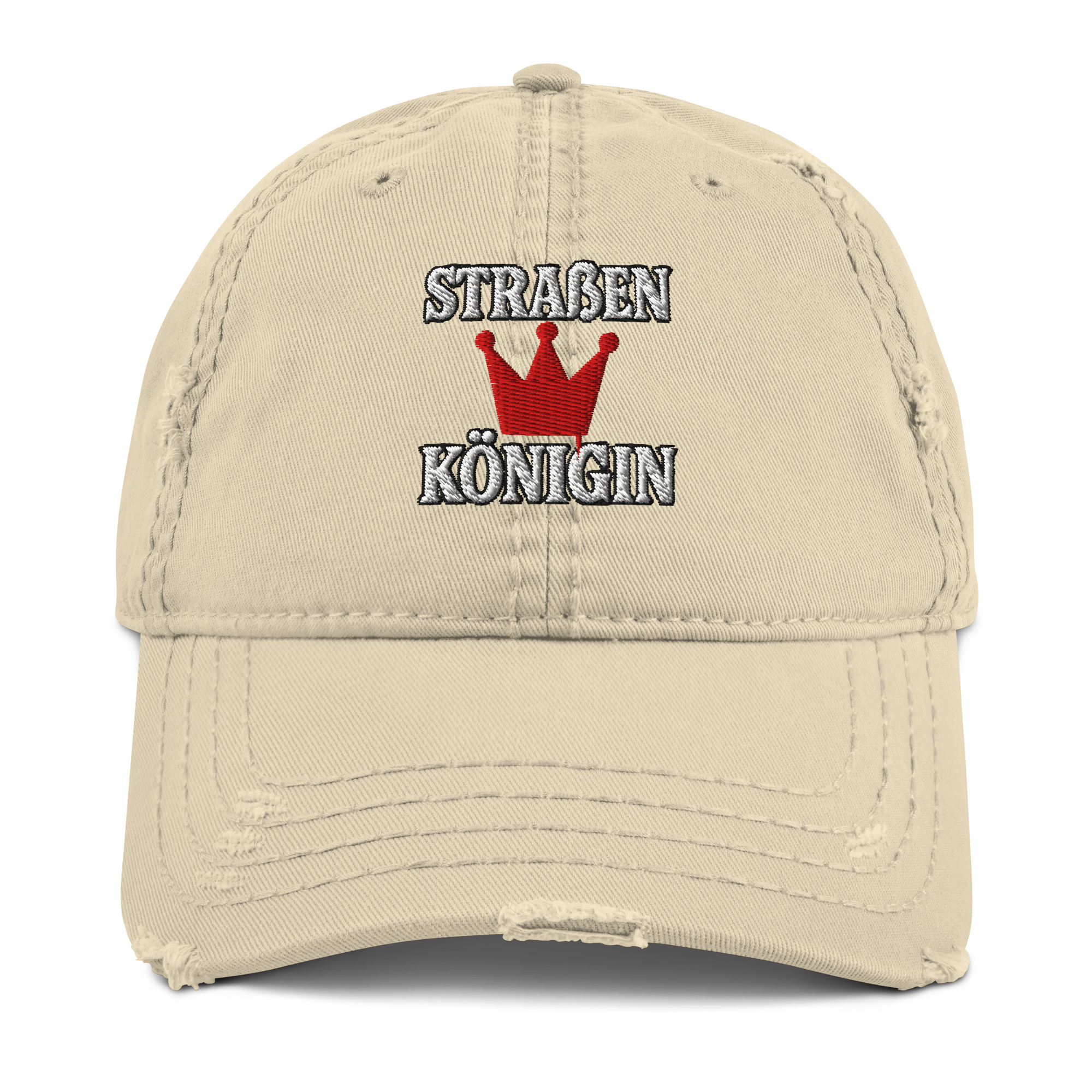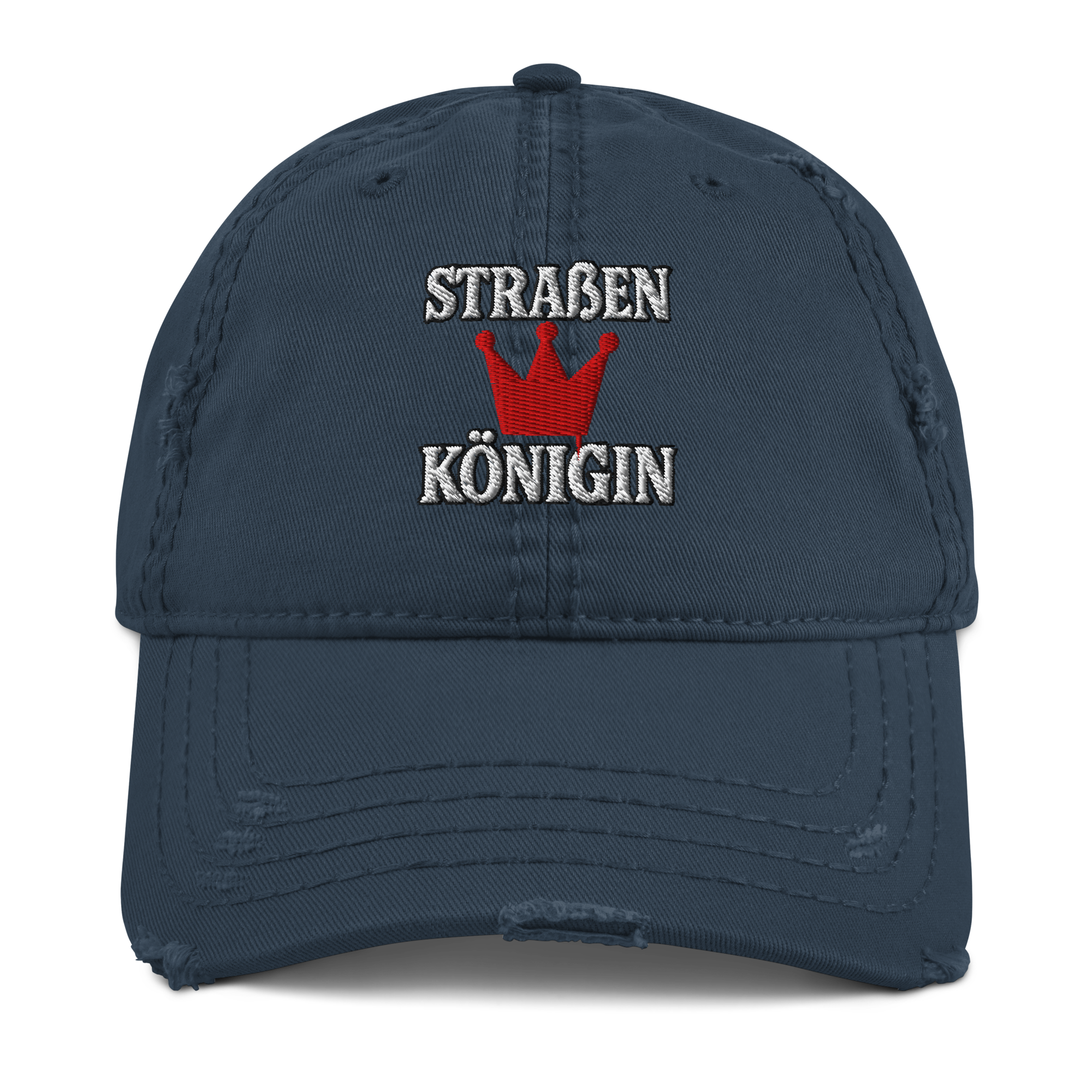 Unstrukturierte Dad Cap im Used-Look mit gebogenem Schild und edlem Front-Stick „Straßenkönigin“ – lässige Krone für starke Auftritte.