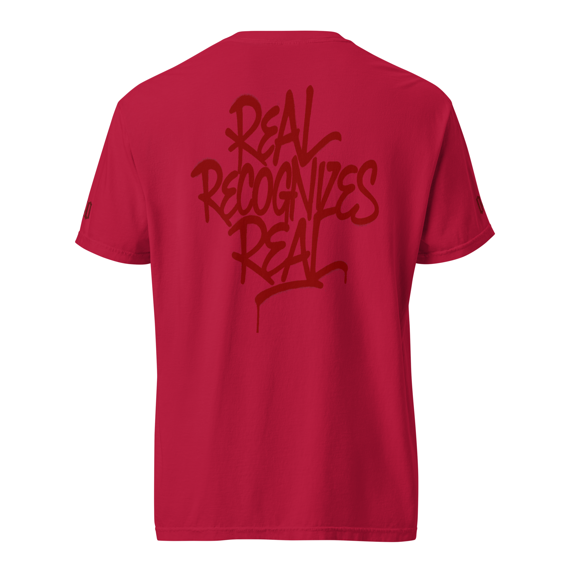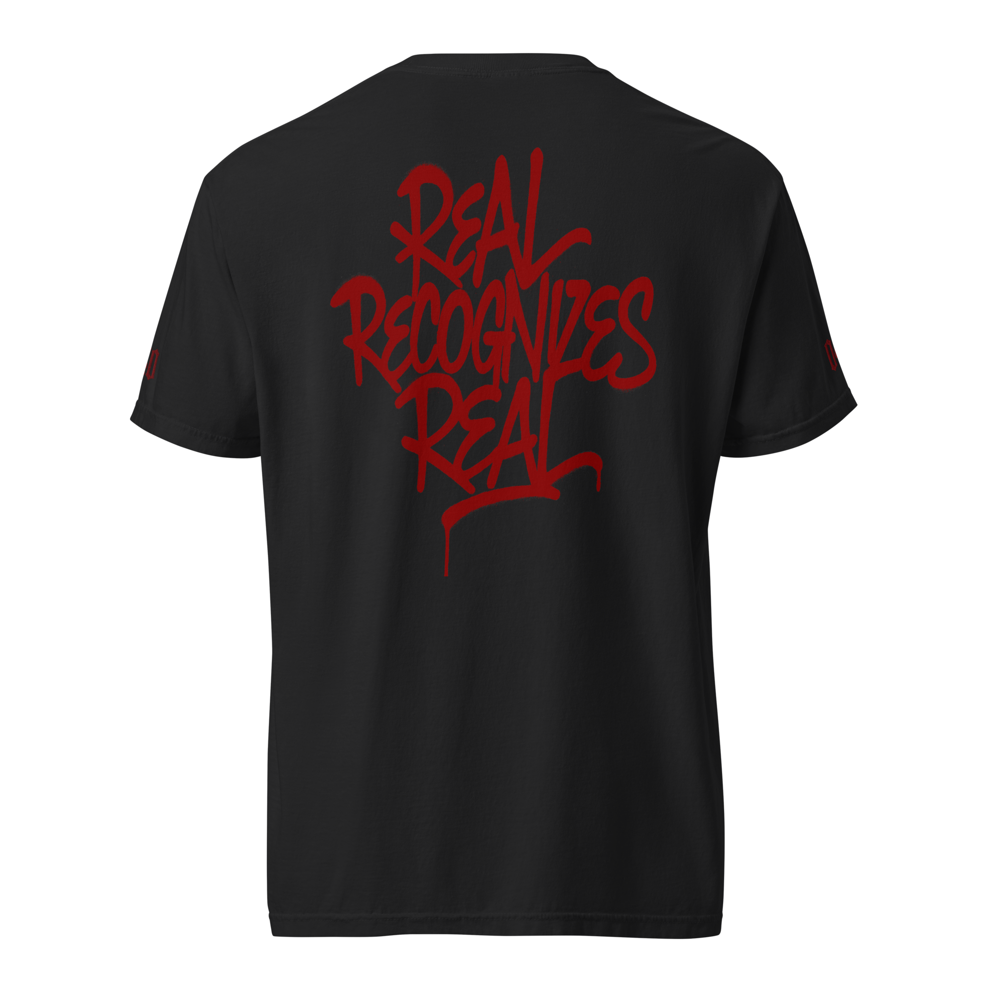 Keine Show, nur Haltung: Dezenter Front-Stick/Print, feines Ärmel-Detail und ein markanter Rückenprint „Real Recognizes Real“ – klar, direkt, echt.