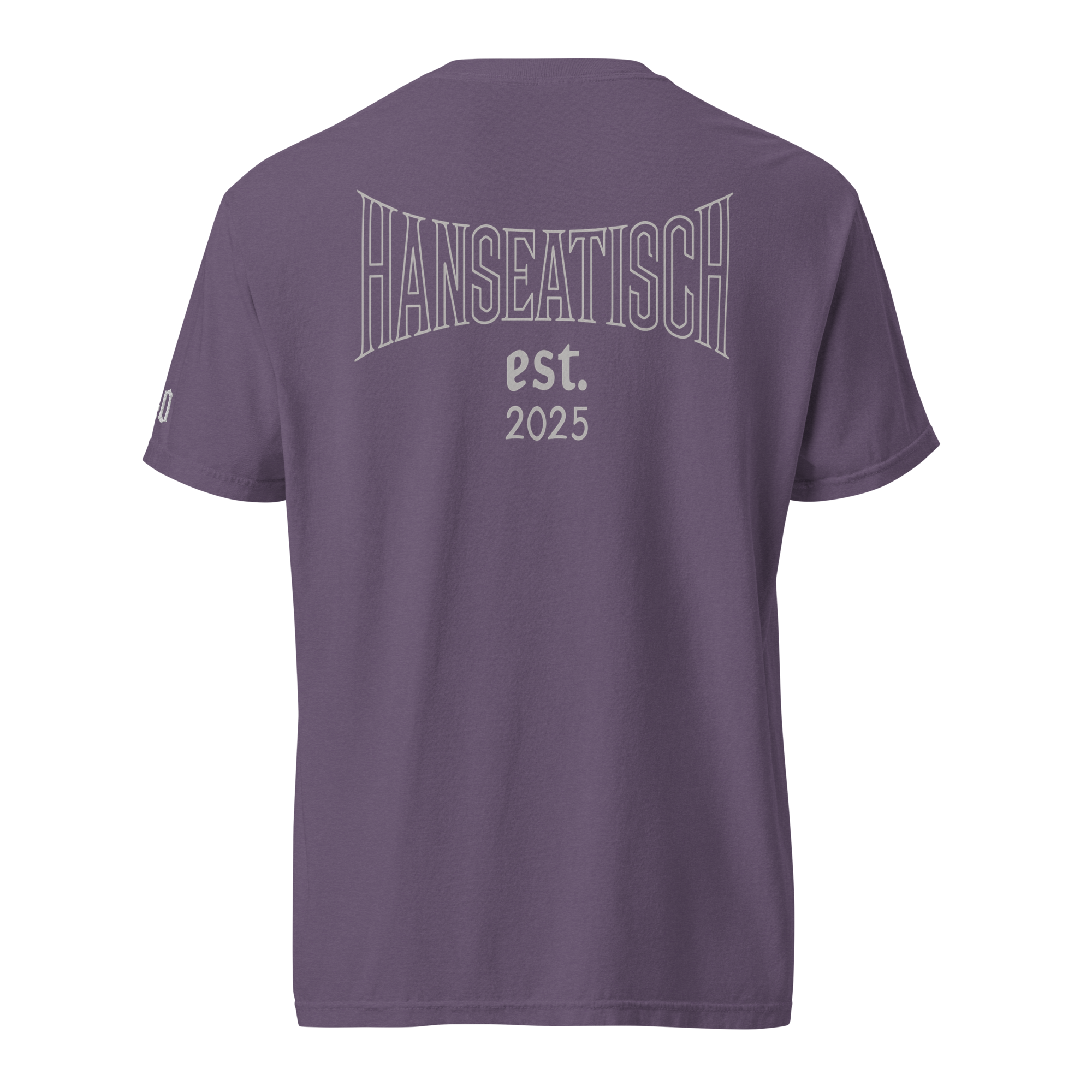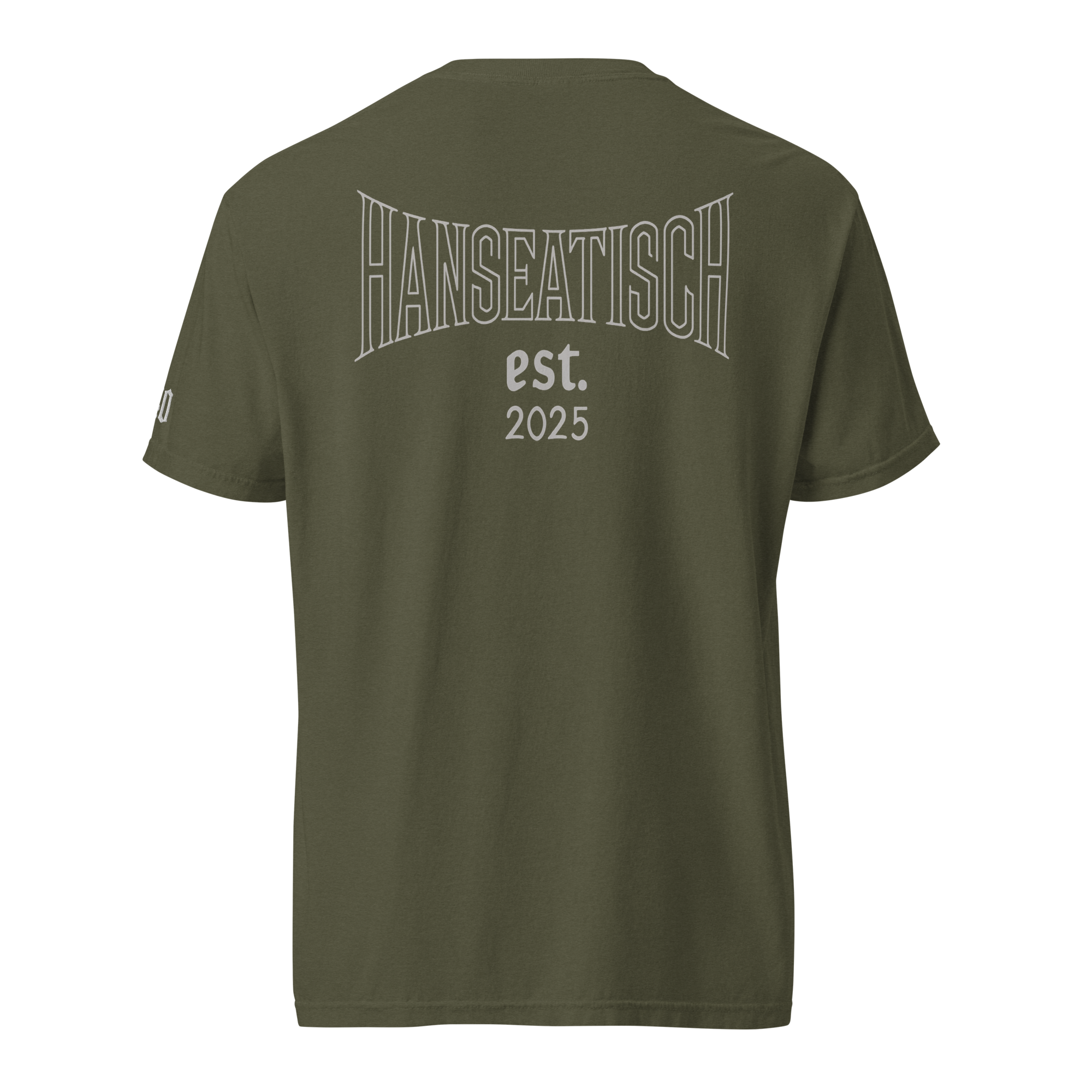 - Design: Frontprint „hanseatisch.“, Ärmel-Detail, großflächiger Rückenprint „Hanseatisch est. 2025“