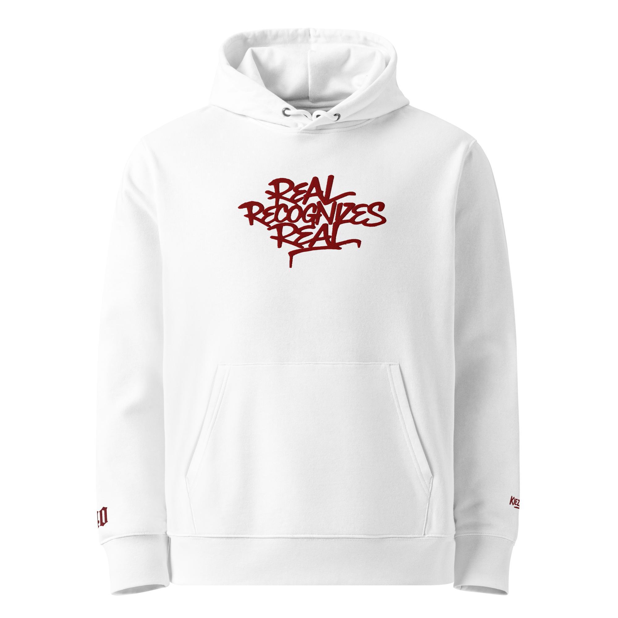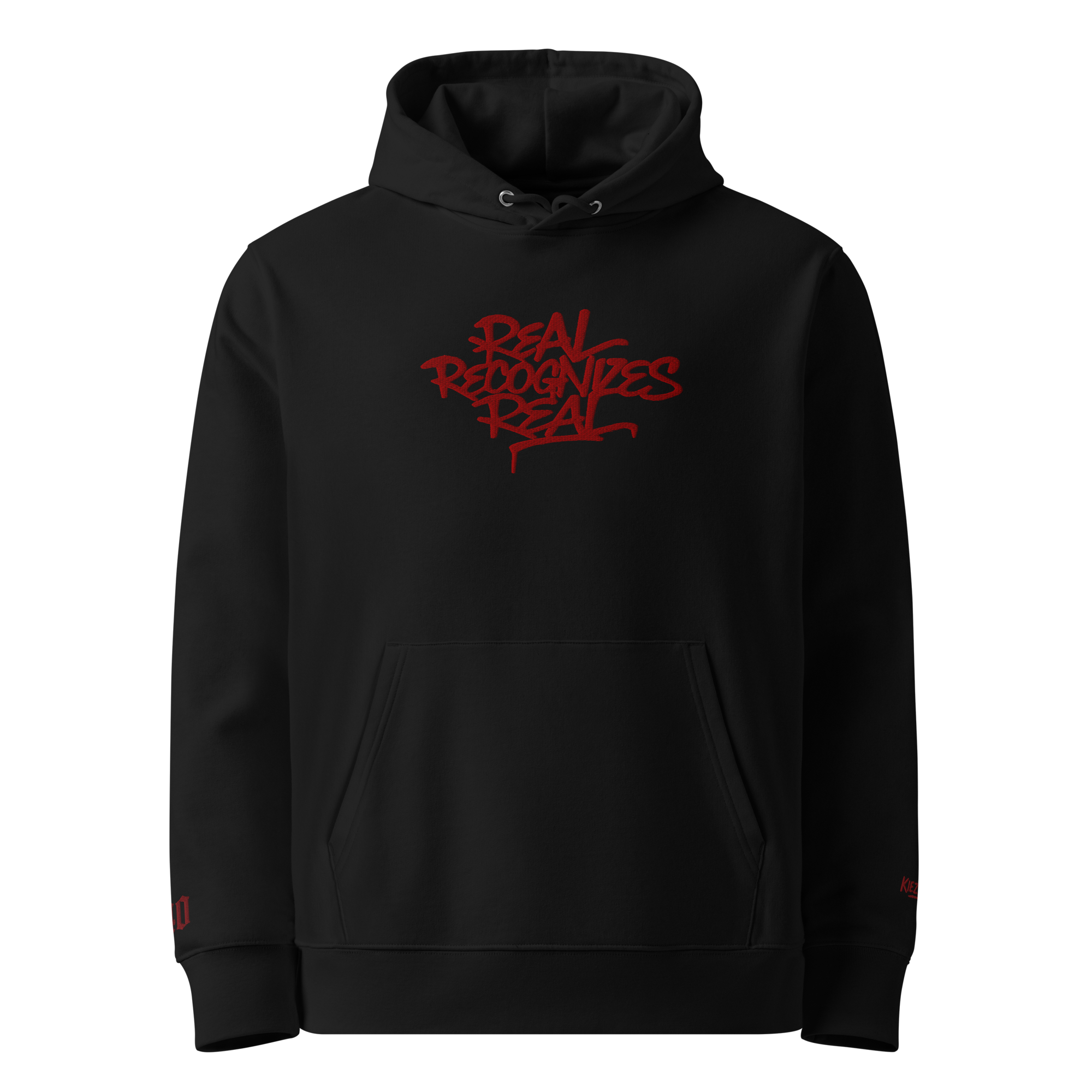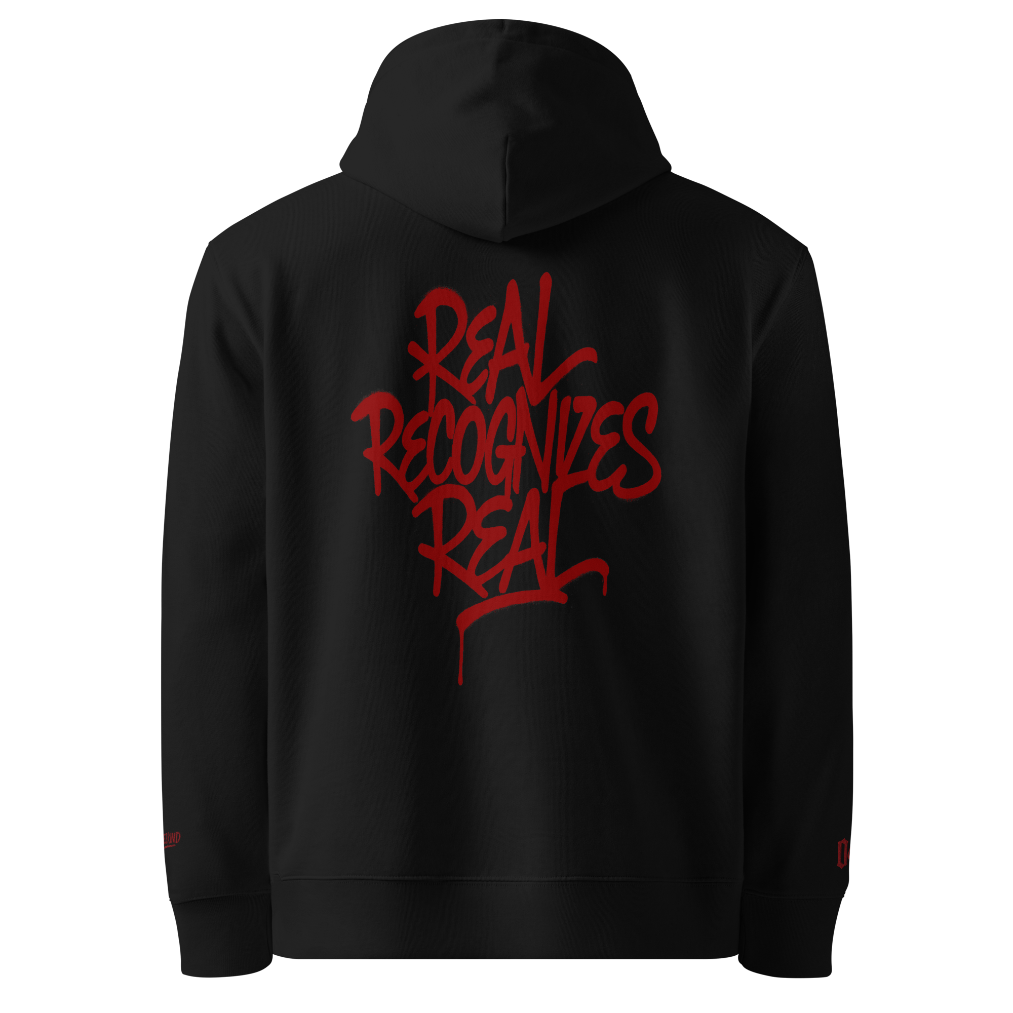 Klare Kante, Null Show: Dieser Hoodie steht für echte Menschen und echte Momente. Stick auf Brust & Ärmel setzt feine Akzente, der große Rückenprint „Real Recognizes Real“ spricht für sich – ohne zu schreien.