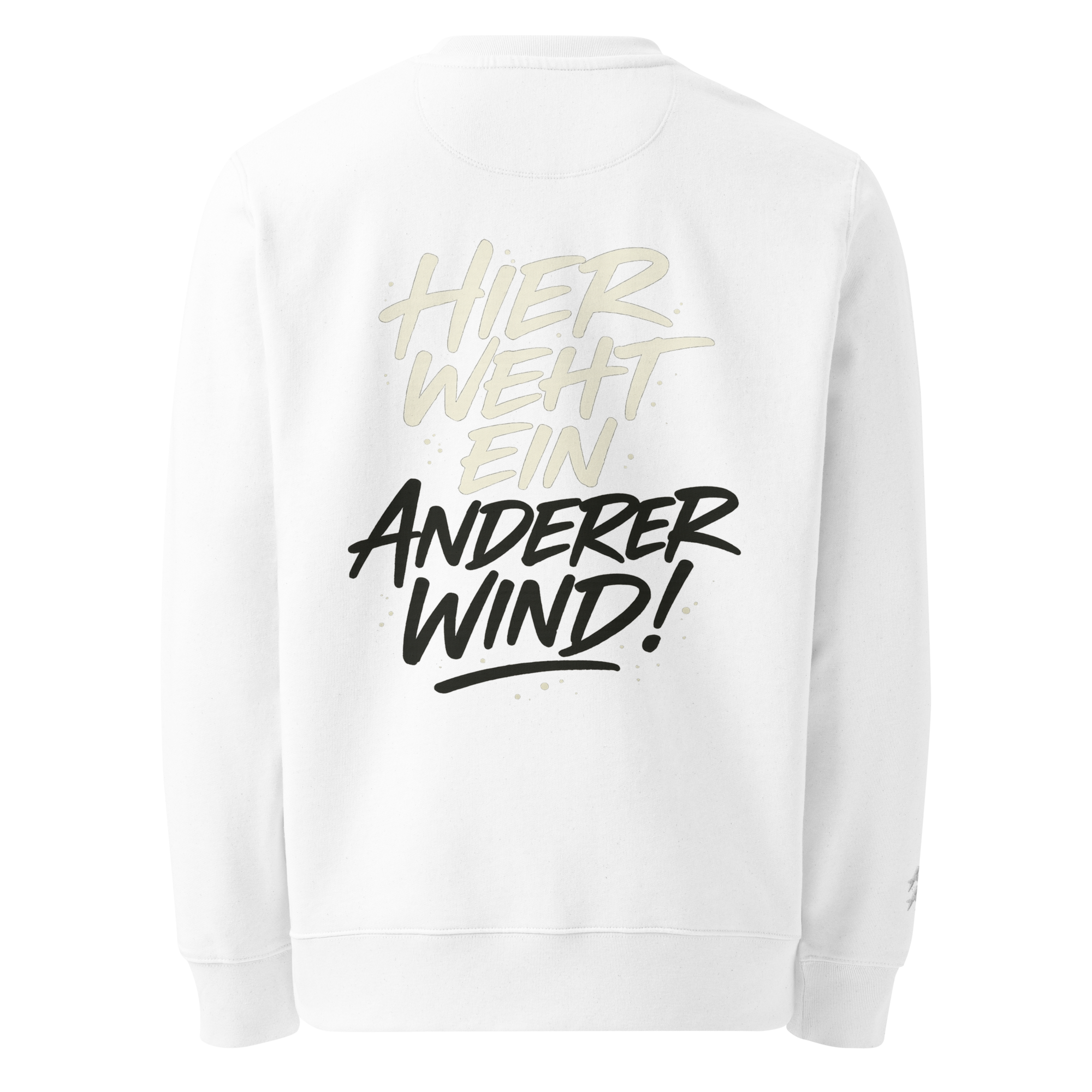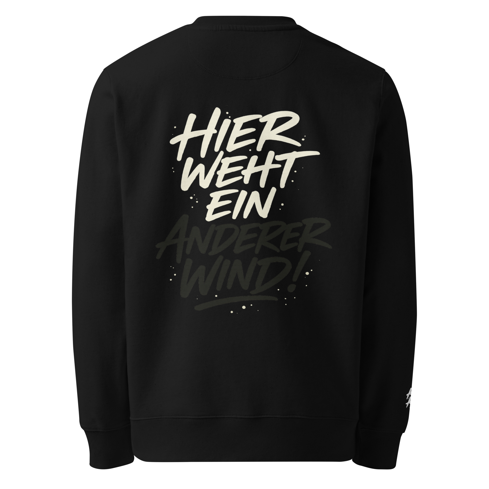 - Markantes Design – Stick auf Brust (links) & Ärmel (rechts) + Rückenprint „Weil hier ein anderer Wind weht!“