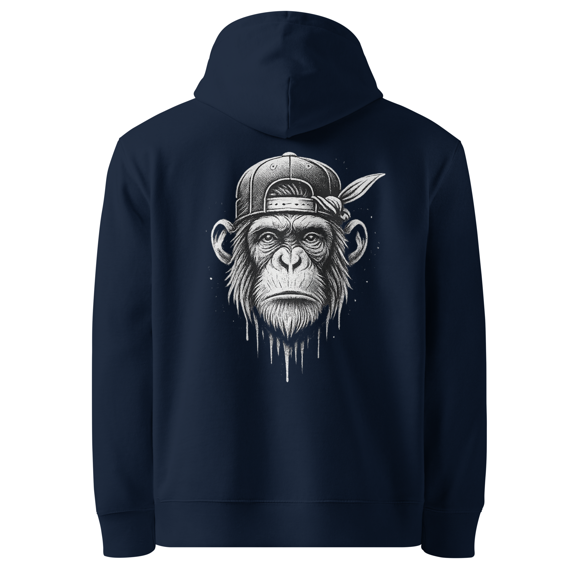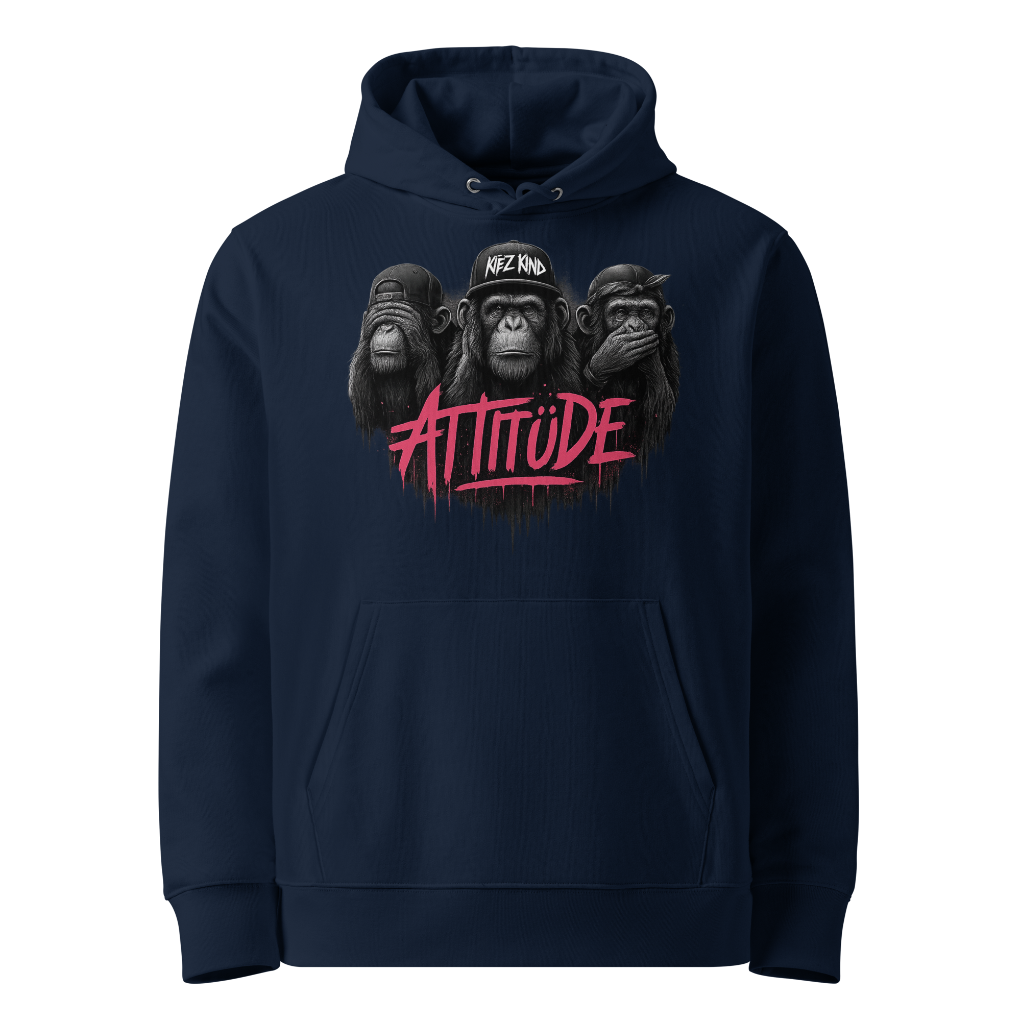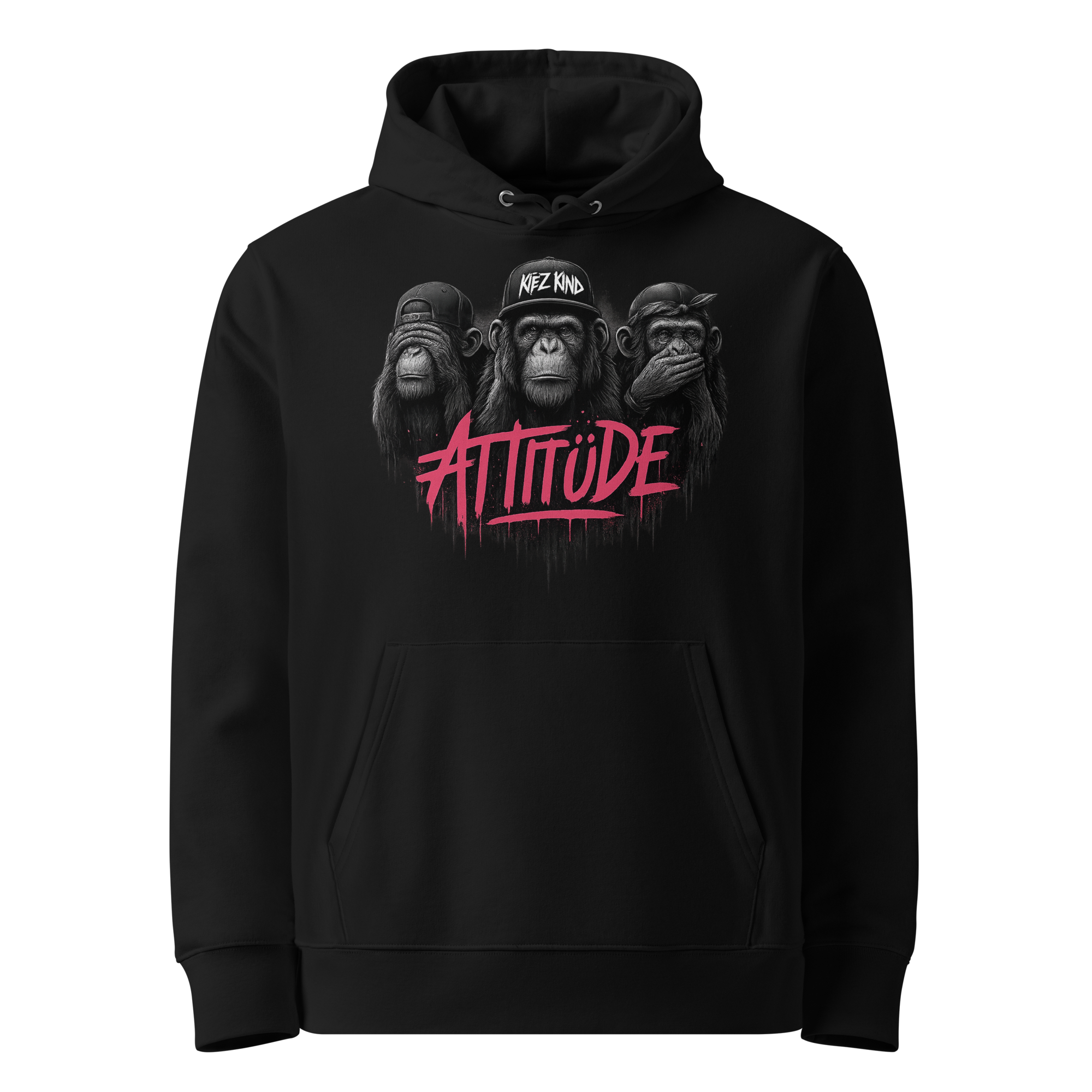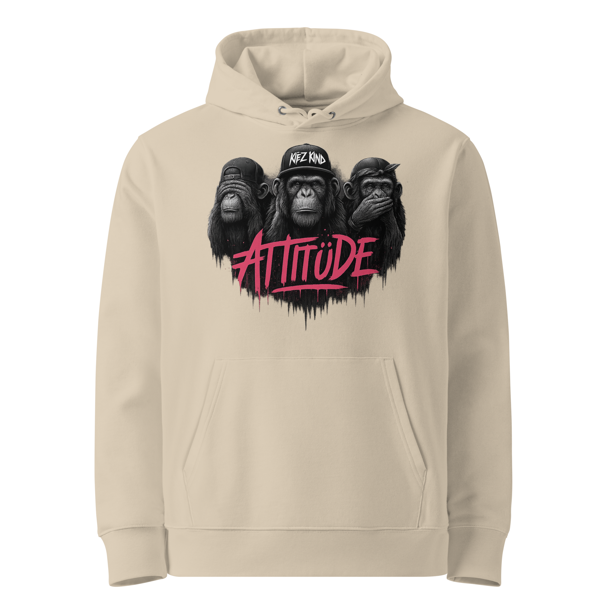 „Nichts sehen. Nichts hören. Nichts sagen.“ – als urbanes Statement neu interpretiert. Schwerer Eco-Hoodie aus 100 % Bio-Baumwolle mit dezentem Frontstick, Ärmel-Detail und markantem Rückenprint der drei ikonischen Gesten.
